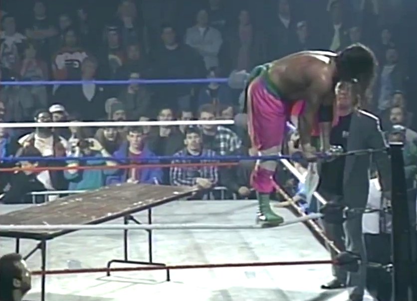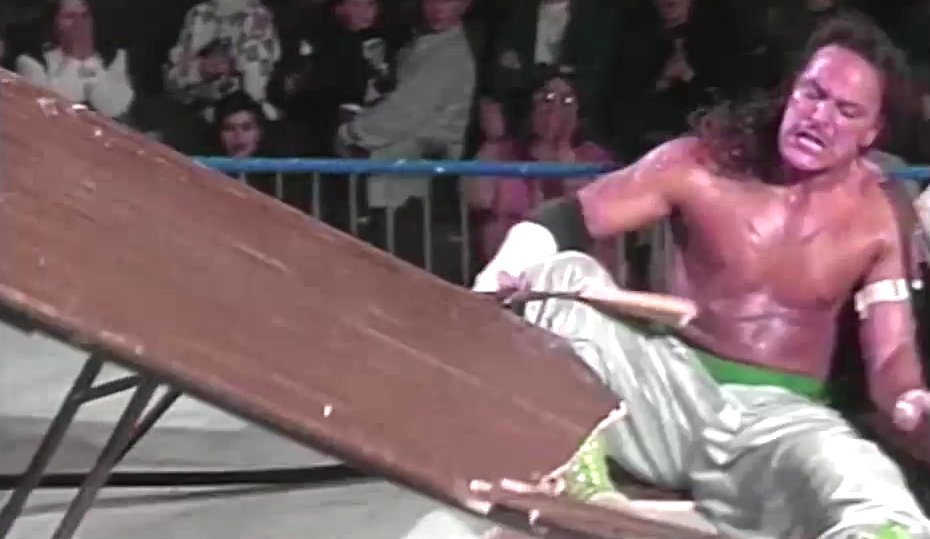 Sabu could wrestle before 1993, but he wound up in the Japanese hardcore promotion FMW because they were there only ones who still wanted his ancient uncle The Sheik to do something that wasn't really wrestling half a lifetime ago when he was actually in his 30s. It shot Sabu from the opening match to the main event, but there were few capable opponents for him, and everything was a barbed wire, street fight, or some other match that tore his body up. Sheik nearly got burned to death in their No Rope Barbed Wire Tornado Fire Death against Atsushi Onita & Tarzan Goto on 5/6/92, but still managed to come out of his coma and wrestle through 3rd degree burns 2 1/2 weeks later. Sabu's table and chair routine was largely developed in FMW because guys were always looking to use weapons even in matches that weren't specifically billed as death matches. Sabu wasn't pushing hardcore wrestling in his early days, but he did it more creatively and athletically than the others. When he wrestled lesser opponents, the match was largely just Sabu jumping at them to make something happen.