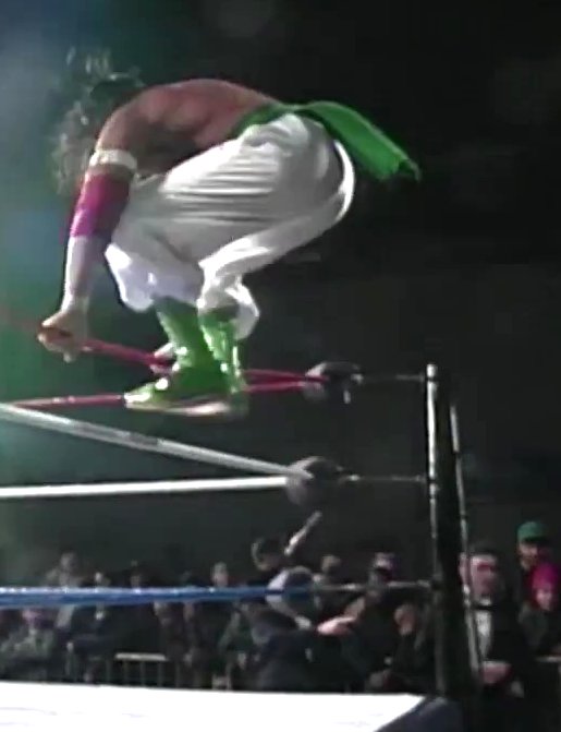 9/7/94 FMW: Sabu vs. Damien 14:33. I've watched most of Sabu's available matches from 1993 & 1994 from every league but FMW, as they mostly wasted him in barbed wire matches against guys that, well, belonged in barbed wire matches. Damien has never been one of my favorites because he's more of an imitation based comedy wrestler, and he might be the slowest rope runner of anyone under 300 pounds, but he's a decent worker when he actually wants to be, and tonight he was trying. He started off doing a big ballerina leap over Sabu's tackle, then trying the same thing on Sabu, and following with Sabu's point to the sky. This sort of comedy from Damien actually added to the match because he was trying to rile Sabu up by trolling him. His typical Choshu Riki lariat and sasorigatame felt out of place. This was mostly an action-packed junior heavyweight style match though. Sabu did most of the best spots, as you'd expect. Damien did a couple dives, and a sort of moonsault where he stood on the apron facing the crowd and leaned back into the top rope, flipping over it into the ring like it was a gymnastics bar. Damien used a chair for a double jump avalanche. This was basically the standard good Sabu match. He didn't really do anything out of the ordinary other than a revenge scorpion, which the fans also chanted "Cho-shu" for. Damien was the one that was doing different things to suit the opponent. Sabu won with a guillotine leg drop with Damien's neck hanging off a chair. ***