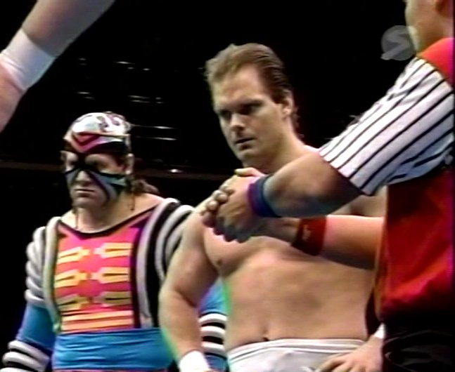 DC: The hand-held footage for this match is quite shaky, but it’s good enough to get a good impression of the match. They lived up to people’s expectations of junior heavyweights being spectacular high flyers. Jushin Thunder Liger and Pegasus Kid were two of the guys responsible for creating these expectations thanks to their tremendous in-ring feud that year. Liger’s tope suicida sent both him and his target, Pegasus, over the guardrail. Pegasus showed some impressive flying of his own, including a dropkick off the top to the floor. Owen’s work was super smooth, and his excellent execution made his work impressive-looking in spite of being slightly less spectacular than Liger and Pegasus. Villano V was the odd one out here, as he came across quite pedestrian compared to the three former Stampede Wrestling superstars. In fact, the crowd even started laughing when Villano did some weak-looking lucha holds, not realizing that the luchador was being serious. The match certainly slowed down a lot when Villano was in the ring. This didn’t stop the others from performing well whenever they were in, though. As the match went on, though, it became clear that the first half was the more interesting half, and this was confirmed when the match just ended somewhat randomly. Owen scored the win via flying elbow. Good match. ***¼